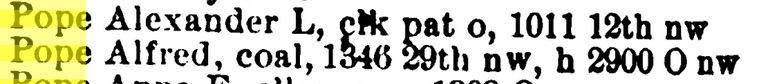 The 1858 District of Columbia Directory lists a William Williams, colored, employed as a coachmen residing in an alley between M and N streets, north, near Vermont Avenue. This location was about two miles due west of Tudor Place and the residence of Alfred and Hannah Pope (who lived at 78 Montgomery street in Georgetown, now 28th and O streets.) Two years later, the 1860 directory lists a William Williams, colored, as a waiter, living nearby at 235 L street, north. (There is not a black William Williams of credible age in the 1860 census in the District.)