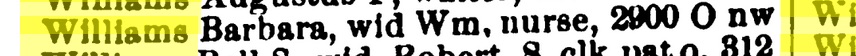 The 1876 City Directory lists a Barbara Williams as a servant at 810 20th Street. After this there is no listing of Barbara for twelve years until the the 1888 City Directory lists a Barbara Williams as a nurse at 1143 Connecticut Avenue.