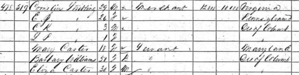 Speculatively the surname Carter of the two other servants in the Stribling household might suggest they had some connection with the household of Congressman Congressman John Carter, where Alfred and Hannah Pope had been enslaved up until 1850.