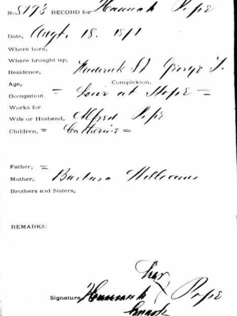 On August 18, 1871, Hanna Cole Pope opened a Freedman’s Bank account in the District, and listed as her mother “Barbara Williams,” but giving no indication of where Barbara was living at the time.