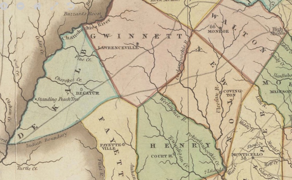 Price’s assertion is supported by several sources. Henry Schenk Tanner’s 1823 “Map of Georgia and Alabama” (from his New American Atlas project, often considered the pinnacle of antebellum American cartography) depicts the eastern extension of what is now the South River, forming the boundary between Newton County and Henry County, as the “Weelaunee R.” Tanner’s map does not depict the headwaters or western course of the river, within DeKalb County or what was then Gwinnett County (before the establishment of Rockdale County); these sections had presumably not been charted at the time of the map’s publication. The map does depict in detail indigenous communities then under the governance of Muscogee (Creek), Choctaw, Cherokee, and Chickasaw nations, primarily to the west of the Flint and Chatahoochee rivers. (At the time of the map’s publication, DeKalb County, bordered to the west by the Chataahoochee, was the westernmost extension of the white-governed state of Georgia.)