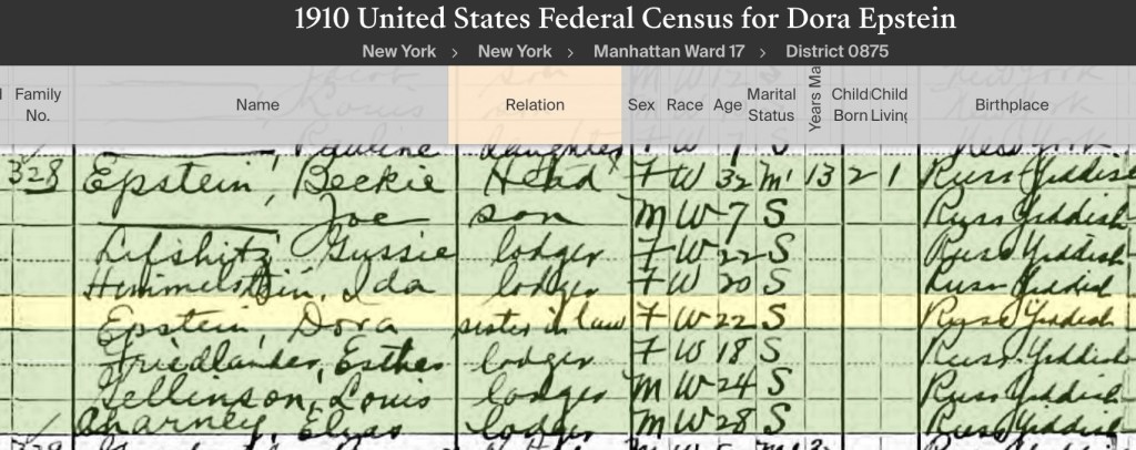 Dora Epstein, in turn, appears to have been established in New York City by this time. The 1910 Federal census, enumerated on 19 April, records Dora Epstein, residing in the home of her sister in law Beckie Epstein on Essex Street, in the Lower East side. Beckie’s son Joe, age 7 lives with them, Beckie is married but it is not clear where her husband is living.