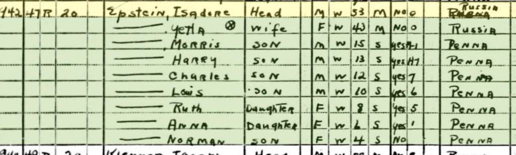 The 1930 census in Reading PA does clearly list “Ischdol” Epstein and his wife “Jennie, who must be Yetta, living with their four sons, Maurice, Harry, Charles, Louis. Isador’s immigration year from Russia is given as 1913. He is working as a tailor in the pressing industry, and the family lives at 309 Belvedere Street in Reading. He is still an alien. Isadore and Yetta are listed in the 1940 census in Reading with all seven of their children; the 1940 census, however, does not list year of immigration.