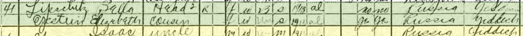 Presumably, within days of the census enumeration, Dora and Samuel wee reunited, following his arrival on the Zieten on or about 21 April. I am not sure if the couple had already been married in Belarus, or if they were formally married in the United States. Dora’s 1910 census entry lists her as single, but I have not found a US marriage record for Dora and Sam. (They may never have undergone a US legal marriage process, just as Isadore and Yetta don’t appear to have been legally Nor havmaried.) e I found a passenger manifest or any naturalization papers for Dora Epstein.