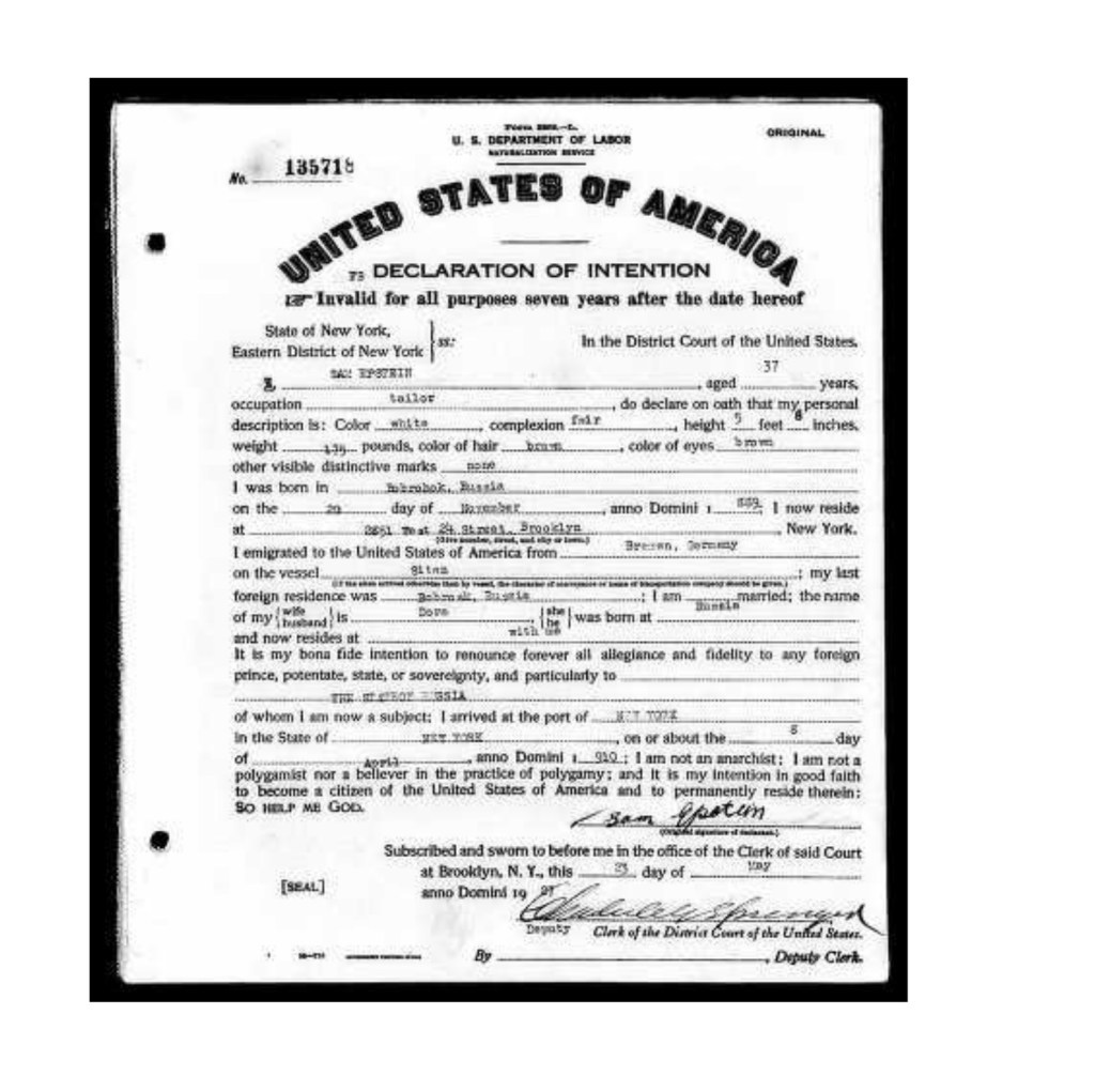 Samuel Epstein’s Naturalization Declaration (23 May 1927) is consistent with this story. It indicates he was born in Bobruysk, Belarus., and lived a 2851 West 24th street, Brooklyn. He states he arrived in New York on the the ship “Seitan” from Bremen, Germany in April 1910.