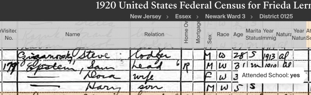 In any event, a decade later, the 1920 census clearly records Samuel and Dora Epstein residing on Prince Street, Ward 4, Newark NJ, with their five year old son Harry Epstein, who was born 11 January 1915. This is the same name that eleven years later Isadore and Yetta would give to their second son, Harry Epstein, born 26 Aug 1926 in Reading PA. Is this coincidence, or were the two couples perhaps naming their sons (who were first cousins) after a common ancestor in the Old Country? (JewishGen’s list of Duma Voters in Belarus does have a 1907 listing for “Girsh Epshsteyn,” son of Lipin, living in Bobruysk, who might a relevant kinsman.)