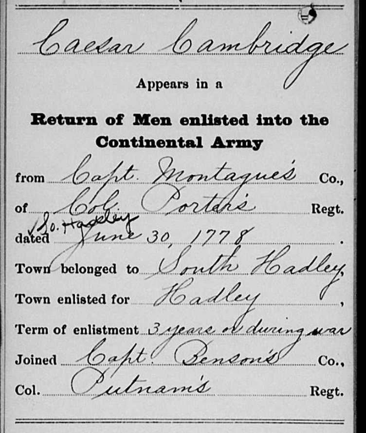 As noted above, Caesar Cambridge served in the Connecticut State Navy until June 15, 1777. On March 5, 1778, in South Hadley Caesar enlisted in the Continental Army. So it seems possible that after June 1777, Caesar was brought from Connecticut (or from Boston) to South Hadley, MA, and labored as an enslaved man for Mitchell until he enlisted in the army on March 5, 1778. The next day Caesar was emancipated, on condition that all his wages were transferred to Mitchell.
