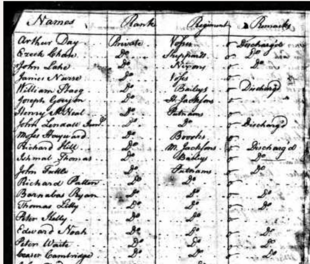 Perhaps related to John Way, Ralph Way enlisted on February 15, 1776 as Private. Professor Marla Miller (UMass Amherst) explains, “Ralph Way was indentured to Samuel Porter (not enslaved) but when Porter died in 1722 his children waived the three years left on Way’s contract.” She further notes, ” Ralph Way was married to Lois Way. They had at least one son, Ralph Jr, whose first marriage was in 1765 (Phillis Smith). He served in the military in 1777, 1778, and 1779.” Perhaps John Wray was also a son of Ralph Sr and Lois Way. The 1790 census for Hadley, Massachusetts records a Ralph Way, heading a household consisting of nine non-white persons