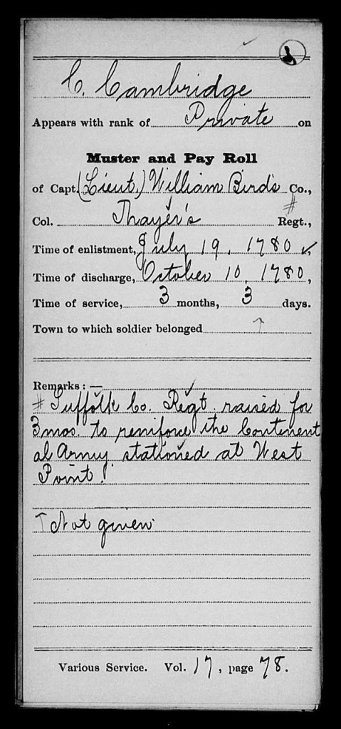 Following the two discharges notes (of August 1780 from the Massachusetts State Navy and October 1780 from the Corps of Invalids) I do not see any subsequent reference to Caesar Cambridge. He does not, for example, appear in the 1790 Federal Census, or the subsequent Revolutionary War pension records (Not until 1818 did Congress provide for pensions for Revolutionary War veterans without disabilities.) I see no record of Caesar’s death or burial.