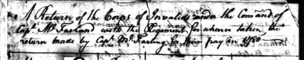 On August 5, 1778 he is listed with the rank of Private, on duty in White Plains, New York. A muster roll of December 15, 1778 records him on duty as Camp Soldier’s Fortune, which was located near West Point, New York. On October 1, 1779 he is recorded at Camp Bedford (evidently, in Westchester County, New York, a town which was burned to the ground by troops under the command of the British officer Samuel Birch on 11 July 1779 ). Caesar is referenced as discharged in a 1780 muster roll, in the “Corps of Invalids. “ (The Corps of Invalids consisted of veterans or disabled or infirm men, who could still carry out limited duties, such as guard duty; many in the Corps seem to have been posted to West Point. New York). His final discharge note appears to be on October 10, 1780, indicating he had performed guard service at West Point, for 3 months and 3 days in Lt. William Birdie’s Company.