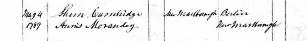 On 4 May 1789, Shem Cambridge married Annis Moranday, in New Marlborough, Berkshire County, MA, about 20 miles east of Granville. They were married by Rev. Jacob Cullen, Minister of the Gospel.