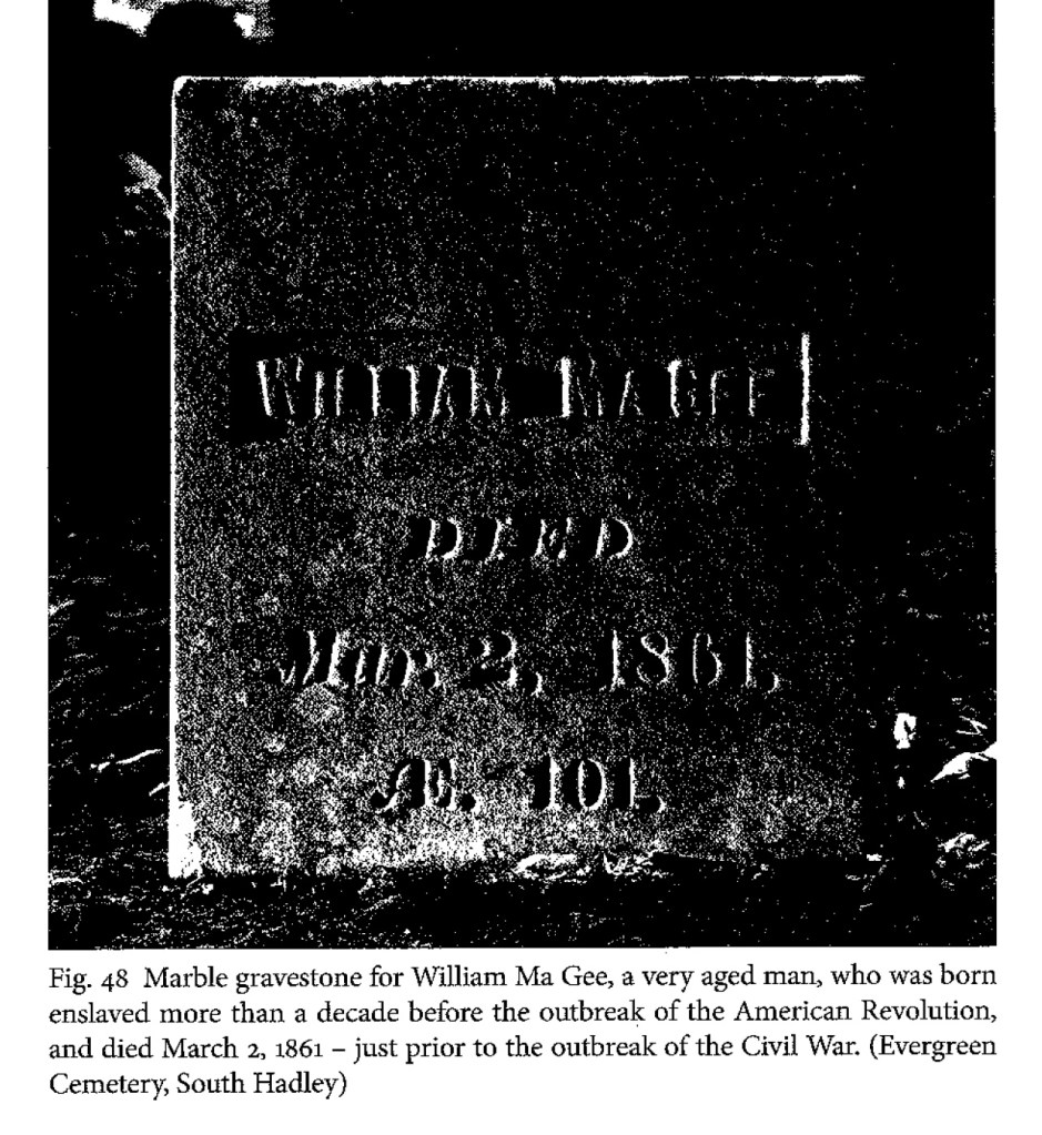 Robert Drinkwater’s In Memory of Susan Freedom: Searching for Gravestones of African Americans in Western Massachusetts (p. 63) records a headstone for William MaGee, said to born enslaved and buried in South Hadley. Died March 2, 1851, aged 101 (which would suggest born around 1760). Headstone said to have been moved “from present site of Gaylord library to the rear of Evergreen Cemetery. ” (fn 119, p, 133). The 1860 census list William MacGee as 99 years old, a servant in the household of white farmer Ayro Burnett in South Hadley. The 1850 census shows him residing in the household of Alpheus Ingram, in South Hadley; his age is difficult to discern, but may be 81, which would imply a birth year of around 1769. He is not evident in earlier censuses, which only listed heads of household. I am not sure if he was enslaved in South Hadley or elsewhere.