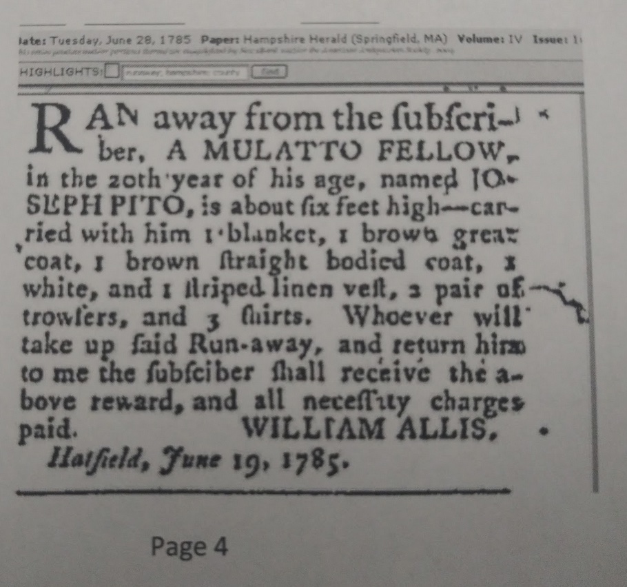 2; Joel Peto or Pito or Pits (?), a free man of color, with two persons of color in his household. He may be the same Joel Pito or Joel Pits who married Hannah Show in Conway, Franklin County , Massachusetts or Deerfield (about 25 miles north of South Hadley) on 27 Nov 1788. “Joel” may be same person as the escaped slave Joseph Pito, “Mulatto Fellow, six feet high, 20th year of his age, runaway”, advertised for by the enslaver William Allis, on page 4 of the Hampshire Herald on 19 June 1785, having escaped from Hatfield MA, about 10 miles north of South Hadley.
