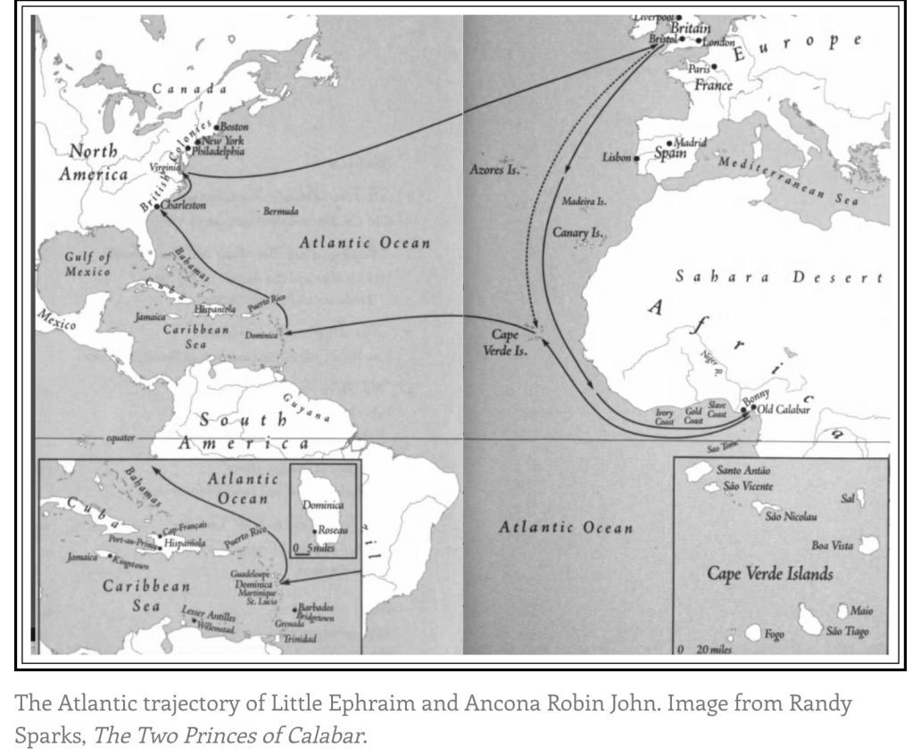 In his fascinating book, The Two Princes of Calabar (2009), Randy Sparks infers that Captain Sharp intersected with one of the most intriguing episodes in the history of the Atlantic slave trade, the story of Little Ephraim Robin John and Ancona Robin John, known as the Robin Johns or “the two princes,” The Robins John, who may have been uncle and nephew, were prominent Efik slave traders in Old Calabar (present day Nigeria), who were captured, sold into slavery and transported to Dominica. Sparks proposes that in Dominica they made contact with Captain Sharp, who falsely promised to return them to Old Calabar, but who in fact tricked them, transporting them to Virginia and selling them to the Bristol-native Captain John Thompson, who abused them seriously. With great difficulty the Robin Johns eventually secured their freedom and returned to Old Calabar. Sharp clearly had connections with the Efik slave traders: Sparks notes that the Efik ruler of Calabar, Grandy King George, the brother of Little Ephraim, praised William Sharpe in a letter in 1773, as a “very good man, ” not knowing that Sharp had tricked his brother and nephew (Sparks 2009, p 168, fn 19)