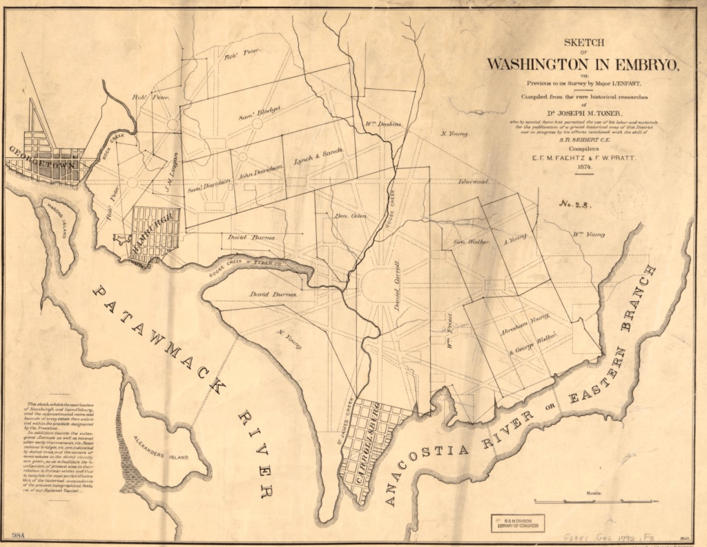 Some sources (eg Keyes Port, n.d.) have evidently misread data compiled in Slave Voyages: the Trans Atlantic Slave Trade database , to conclude that enslaved people were landed in Georgetown for sale much earlier, from at least 1732 onward. This is improbable, since the town of “George” or “George-town” was not even laid out until 1751. The principal mistake appears to be misreading the destination “North Potomac” as meaning Georgetown, whereas “North Potomac” simply seems to be a designation used for the north bank of the Potomac river, stretching about 100 miles from the river’s mouth on the Chesapeake Bay to the Fall line, near the modern day site of Georgetown. Generally speaking, the voyages that terminated in “North Potomac” seem to have landed many miles downriver of the present day site of Georgetown, in Charles County or St Mary’s County, Maryland