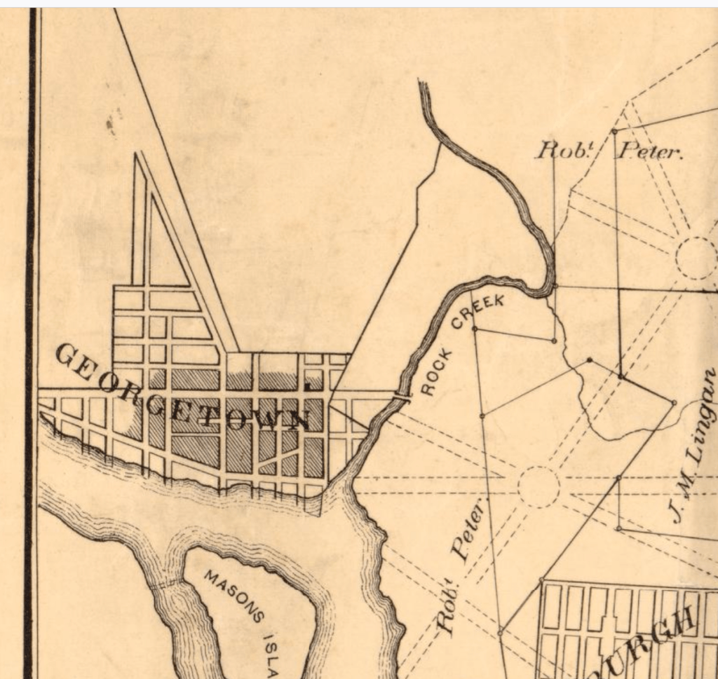 The advertisement’s location is given as “Rock Creek”, whereas the ad placed by Robert Peter a year earlier for Isaac and Sarah listed “Georgetown.” One of Peter’s many properties was the Rock Creek Quarter, a farm which appears to have been located along the eastern bank of Rock Creek. (Dr J.M. Toner’s map, “Washington in Embryo,” published in 1874, based on his own research on the landscape of the future District of Columbia before the Federal City was laid out around 1790, shows Rock Creek as rather wider than it is now, and indicates that Robert Peter owned an expanse of land east of the creek, from the Potomac River heading north.) Following his death, Rock Creek Quarters and its slaves and livestock were sold from Robert Peter’s estate on January 25, 1808 (the list of property is archived at Mount Vernon). Robert Peter’s general store is thought to have been located in the Wapping Quarter of Georgetown, on the west bank of Rock Creek. roughly where K street now crosses Rock Creek, underneath the present Whitehurst Freeway.