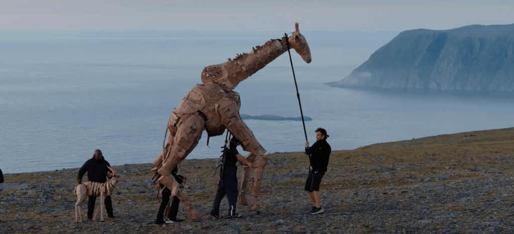 In some ways, The Herds inverts the logic of Little Amal. The Syrian child was seeking her mother; here, the hundreds of animal refugees are escaping the violence done to our shared Mother, the Earth itself. Little Amal was a supplicant, her much discussed distress and tween ungainliness evoking sympathy and compassion (along with episodes of xenophobic denunciation in some quarters during her trek). The Herds’ animals, in contrast, are hardly pleading; they are fierce and majestic, roaring and springing forward through the air, or in the case of the giraffe, nobly towering above us all as it canters through city centers and up a vast, imperiled glacier. The Herds are in danger, but the emotions they engender are, generally speaking, not so much pity or compassion as much as awe, tinged at time with a frisson of fear.