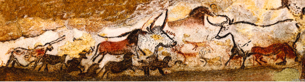 Rites of passage, which move human beings through successive stages of maturation, very often draw on the performed symbolism of wild animals, who in effect kill off earlier stages of one’s life to give birth to higher degrees of consciousness and advancement There is strong reason to think that the subterranean chambers of Chauvet and Lascaux, adorned with vibrant charging herds of wild beasts, were used as collective symbolic wombs to birth new generations of human adults, who in turn would capture and channel the energy of wild nature through painting (probably combined with musical and dance performances) in turn to collectively rebirth future generations of their posterity. Now, in 2025, tens of thousands of years later, something of that earlier impulse is rekindled: the power of the animal herd, it is hoped, will re-inspire a new stage in human development, moving our species beyond obsessive resource extraction towards a shared mutual care for our biosphere and all who make up the intricate global web of life.