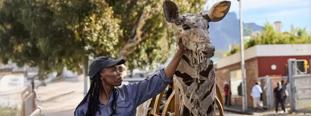 The Herds project is both a continuation and transformation of the earlier transnational project, “Little Amal,” in which a single 12 foot girl puppet, representing a Syrian refugee child, travelled westward across Europe seeking her mother. Both projects, guided by artistic director Amir Nizar Zuabi, were organized by the production company The Walks, under producers David Lan and Tracey Seward. The theme of refugee movement infuses both projects: the migrating wild animals of the Herds are in some respects avatars of untold masses of displaced human climate refugees from Africa and elsewhere who have hazarded perilous crossing of the Mediterranean, often at the cost of their lives, in search of survival and a better life for themselves and loved ones they have left behind. Both projects emerged out the brilliance and ingenuity of Ukwanda Puppetry and Design Art Collective, based at the Centre for Humanities Research in South Africa’s University of the Western Cape, where the Ukwanda team are resident artists. (See an exemplary history of the collective, associated with a recent exhibition curated by art historian Rory Bestar.) Ukwanda, founded by Luyanda Nogodlwana and the late Ncedile Daki in 2010, was mentored by Adrian Kohler and Basil Jones of Handspring Puppet Company (famed for Ubu and the Truth Commission and War Horse among many other projects).