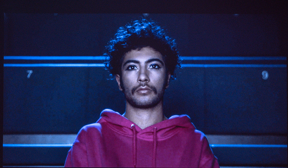 Description: This mesmerizing 13 minute French-language Afrofuturist video work stars Sorour Darabi, the Iranian-born, Paris-based choreographer, dancer, and artist. The film follows the character Mejda played by Darabi (identified halfway though as the “The Chosen One” (“L’élu” ) on a surreal journey of self-realization. In the opening scene the male protagonist walks, perhaps a little swishingly or mincingly, through a banlieue, a lower income Parisian suburb, as night falls. He enters a green modernist building and attends screening of a film. Wearing a purple hoodie, he falls asleep in his seat as futuristic electronic music is heard in the background. (The ensuring scenes may comprise a dream sequence).