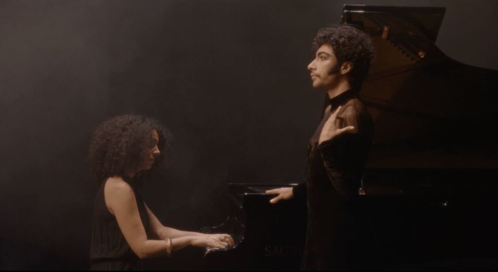 We cut to a blue lit hallway where the hero walks slowly, in full diva splendor, wearing a fur coat, seen from behind. He turns to the left. A young man tells him the aliens are looking for you, gesturing inwards, noting that the show will begin. Our hero advances dressed like an elegant lounge singer, towards a beautiful light skinned Black woman sporting an Afro (perhaps also Annisa Kaki?) seated at a piano. As he advances he slowly takes off his fur coat, allowing it to drop to the floor, revealing his long black cocktail dress and a black choker around his neck.