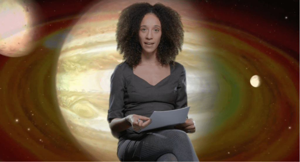 We then cut to a hilarious out of this world newscast, delivered by beautiful lighter skinned Black woman (played, I believe, by Anissa Kaki) sporting an Afro, in front of a montage of outer space scenes. She reports that the city (presumably Paris) is under attack by aliens, who have kidnapped corporate CEOs while leaving untouched the most vulnerable among us.