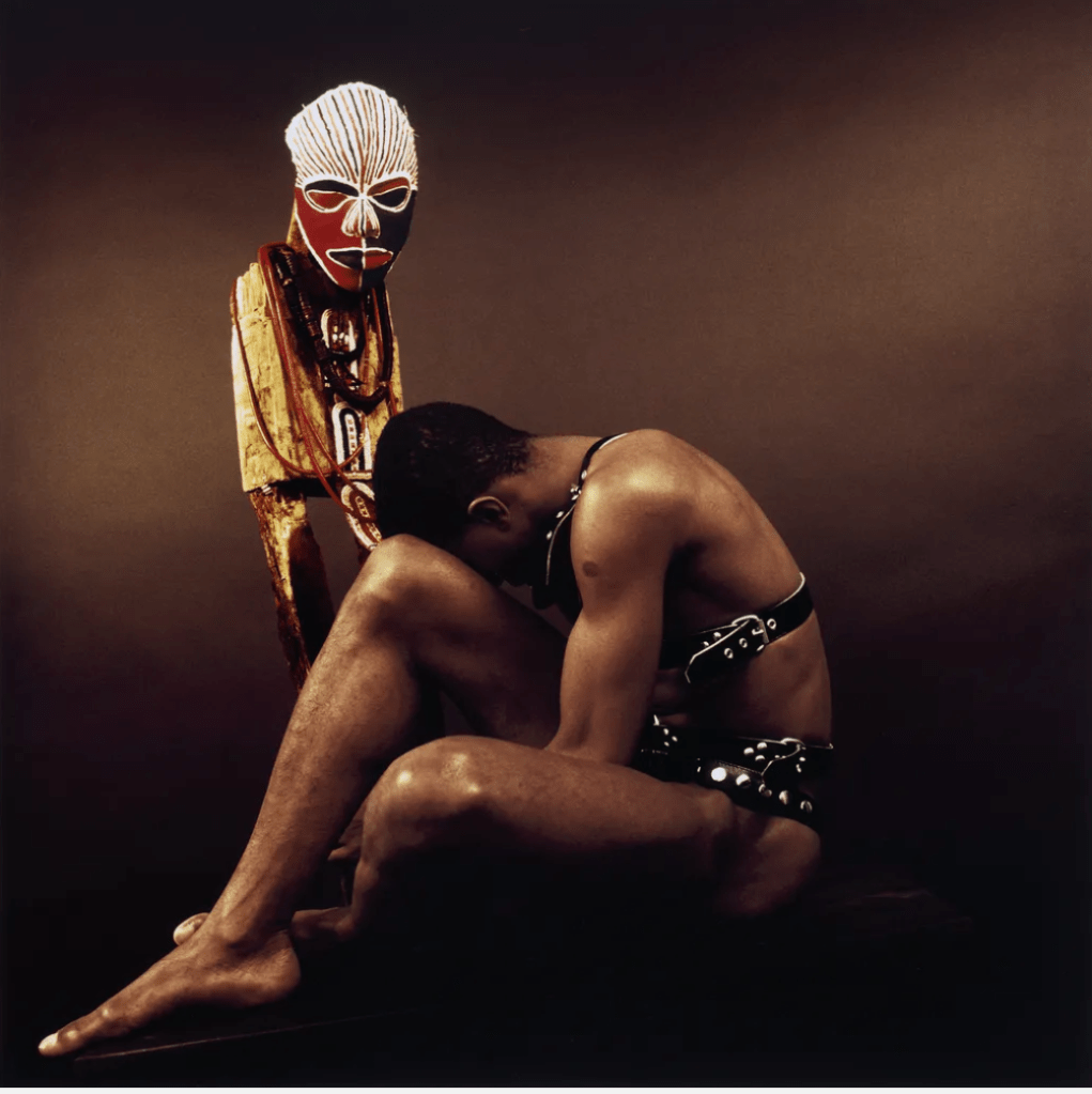 Visual Description: In a large format, richly colored photograph, the artist is viewed in profile, unclothed except for a leather and metal harness that criss-crosses his neck, chest. and waist area. He is prostrate in front of a standing Yoruba-style sculptural figure with a red face, and a forehead marked with alternating vertical red, blue and white stripes. The sculpture, evidently created by Fani-Kayode’s collaborator Alex Hirst, does not directly resemble any known work of African art, but may evoke the iconography of the orisha Eshu, (or Èṣù, also known as Elegua), ambiguous Lord of the Crossroads.