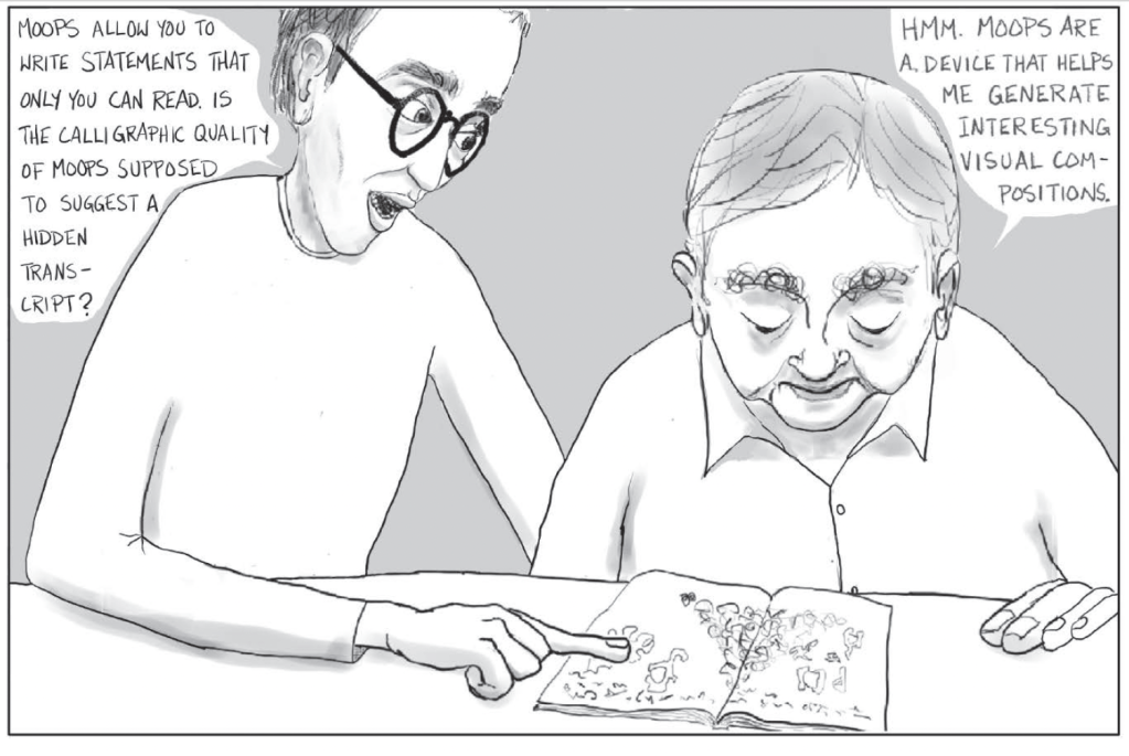 Yet to his son’s question Richard responds in a way that indicates his frame of reference is quite different: “ Hmm. MOOPS are a device that help me generate interesting visual compositions.” In other words, Joshua’s primary orientation is towards decoding textual meaning in the MOOPs, whereas his father the artist emphasizes the power of image.