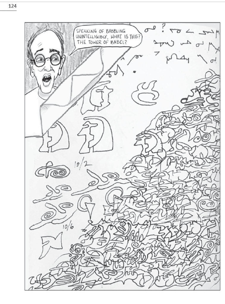 Then on the next sequence, as we turn the page, the father Richard is visible on the upper right, gazing into another page of piled inscription, dubbed a “Tower of Babel.”