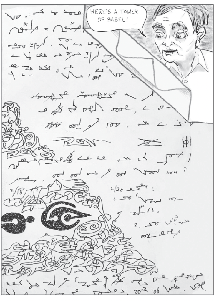 In a particularly poignant example of this partial encounter, on p. 123, Joshua addresses his Dad: “MOOPS allow you to write statements only you can read. Is the calligraphic quality of MOOPS supposed to suggest a hidden transcript?“ The question is reminiscent of political scientist James Scott’s concept of the ‘hidden transcript’, a touchstone of modern anthropological analyses. which often emphasizes decoding the perspectives of the subaltern.