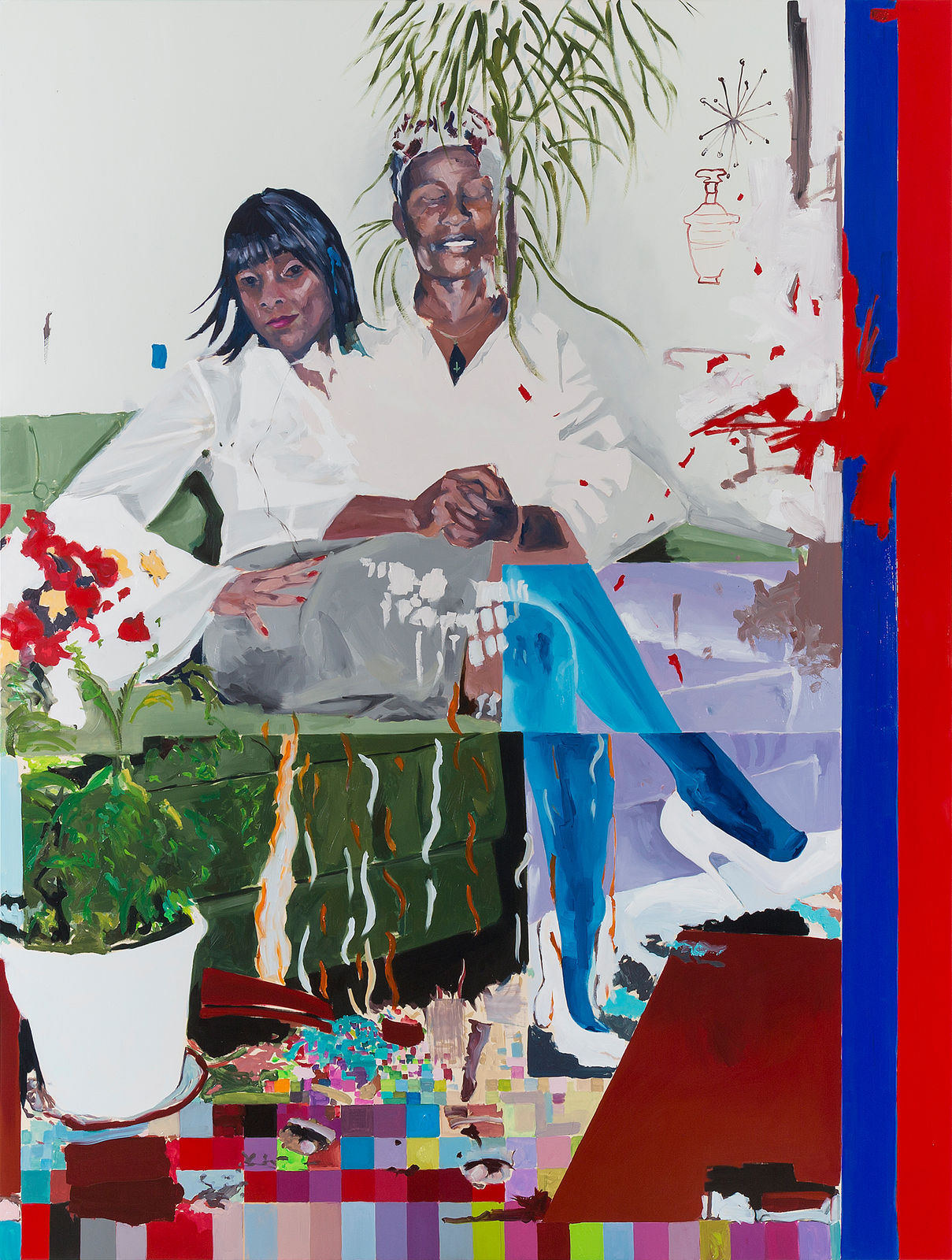 A further intriguing instance of cross-cultural exchange is suggested by Richard’s incorporation of design motifs from the textile art of the Kuba people of Central Africa. In Flash of the Spirit, art historian Robert Faris Thompson famously observes that African music and art forms are often enlivened the off beat phrasing of accents, breaking the expected continuum of surface regularity, by staggering and suspending established pattern. Something similar, we might speculate, unfolds with Richard’s MOOPs, characterized by poly-rhythmic musicality of overlapping off beats. The eye cannot quite determine where to rest, and that “cognitive indecipherability” is part of what so seductively draws us in.