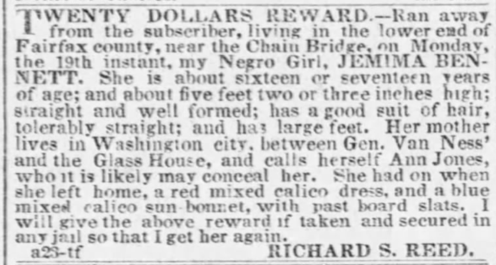 Ann Bowie, age 22, owned by Morris Adler, who (as noted above) purchased Ann for $800 from Charles Richard Belt on 15 September 1859.