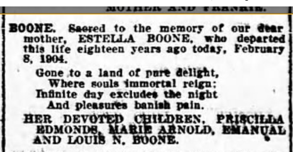Nineteen days earlier, on February 8, 1904 a woman named Estella Boone died. She was buried on February 11, 1904, also in Mount Zion Cemetery. The Evening Star on February 12 also reports her address as 514 Ricketts Court; the 1900 census indicates she had given birth to five children, one as recently as October 1899. We may thus safely conclude that Estella Boone, the wife of Victoria Emmanuel Boone, was the mother of Moses Boone, born 1902.